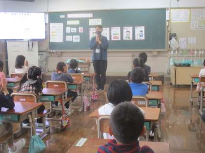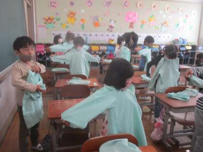 エプロンの正しい着方や準備の仕方などについてしっかりと話を聞くことができました。これで給食はばっちりです。エプロンをたたむ練習もしましたが,みんな上手にできていました。