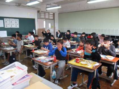 今日から給食が始まりました。みんなが待ち望んでいた初給食は,ミートソーススパゲティやりんごゼリーなど子どもたちに大人気のメニューであっという間に完食しました。1年間通しての残菜ゼロを目指してみんなでおいしくいただきたいと思います。