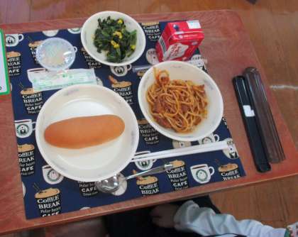 4月14日の給食は,こがたコッペパン,牛乳,スパゲティのミートソース煮,ほうれん草のソテー,りんごゼリーでした。1年生にとっては,養正小学校で食べる初めての給食でしたね。「おいしい〜!」と言いながら楽しそうに食べるみなさんの笑顔をみることができて,とてもしあわせです。