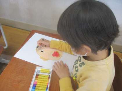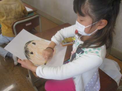 顔のパーツを確認しながら描き進め,丁寧に色を塗って完成させることができていました。みんなとても上手に描くことができました。