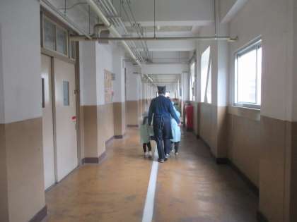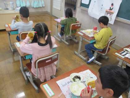 今日の給食は,ルーから手作りのあつあつカレーでした。校長先生も手伝ってもらいながら,じょうずに教室まで運ぶことができました。一生けん命に運ぶ1年生の姿が,とてもかわいいです。