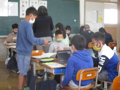 理科の時間では次回の時間の実験に向けて,方法を班で検討していました。考えた方法については,GIGA端末で写真に撮り,記録に残したり,先生に送信したりしました。