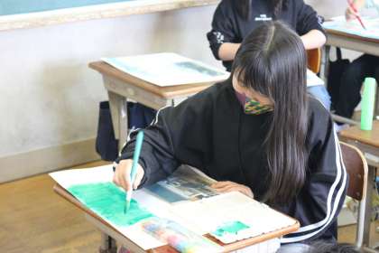 図工科の学習で,自分のお気に入りの場所の絵をかきました。みんなで,学校内を回っていき,自分の描きたい場所を見つけました。そして,その写真を見て,丁寧に下描きし,絵の具で色付けしました。