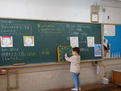 きょうは,ながいはりが 1しゅうする「時間」について かんがえました。