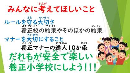 ルールを守ろう,マナーを大切にしようと一人一人が思って,安全で楽しい養正小学校にしていってほしいです。