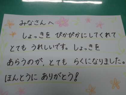 先日,担任の先生からみなさんへ「しょっきがきたなくて,調理員さんがしょっきをあらうときに,こまっている」というお話があったと思います。その日の給食後,調理員さんはとてもうれしそうな顔をされていました。なぜかというと,どのクラスもしょっきがピカピカだったからです。みなさんのやさしさに,感動しておられました。