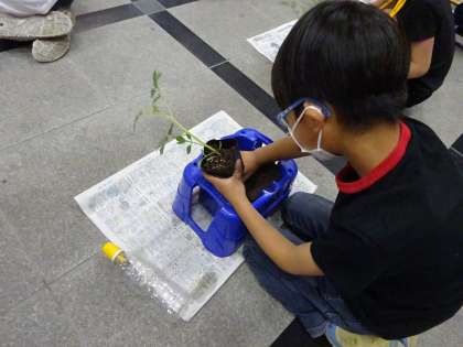 やさしく,ていねいに,ポットから出したり,土をかぶせたりしていました。