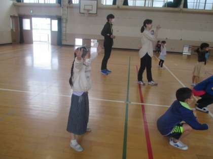雨で大縄は中止でしたが,その代わりに1.2.3年生は中間休み体育館で体じゃんけんをして遊びました。舞台に立つ6年生との体じゃんけんは大盛り上がりでした。