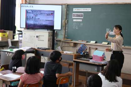 栄養教諭の先生に,食の指導として「上手な間食のとり方」について教えていただきました。普段から間食をしていることの多い子どもたち。しかし,子どもたちがよく食べるものには,塩・砂糖・油などが多く含まれていて,とりすぎるとよくないものがたくさんありました。だからこそ,このまま今の間食を続けるのではなく,食べるものを変えたり,食べる量を工夫したりすることが必要だと,子どもたちは考えました。
