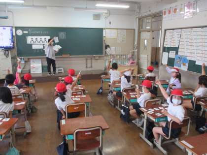 担任が出した数字を見て10になる組み合わせを数字カードの中から見つけるゲームをしました。子どもたちはゲームが進むにつれてどんどん覚えることができていました。これからのたし算につながる大切な学習なので,繰り返し学習していきたいと思います。