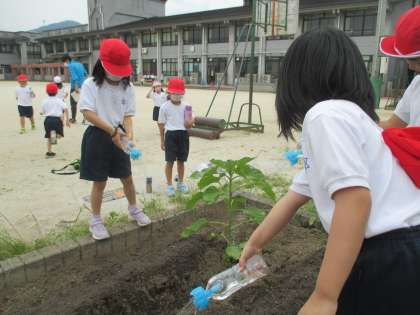 1年生の大きな花壇にひまわり・ふうせんかずら・マリーゴールドの3つの花の種を植えました。早く芽が出てほしいですね。