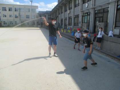 体育の時間に大縄をしました。最初は難しいと言っていた子どもたちですが,何度か跳ぶとコツをつかんで上手に入って跳んでいました。