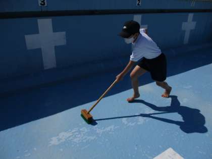 プールサイドやプールの中など隅々までブラシを使ってきれいにしました。