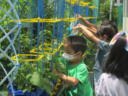 天気がいい日が続き,そして毎日の水やりを頑張っている成果もあり,あさがおがとても大きく育っています。だんだんつるも伸びてきました。これからどんな色の花が咲くのかとても楽しみです。