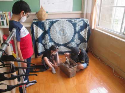 カブトムシのさなぎを教室で育てています。