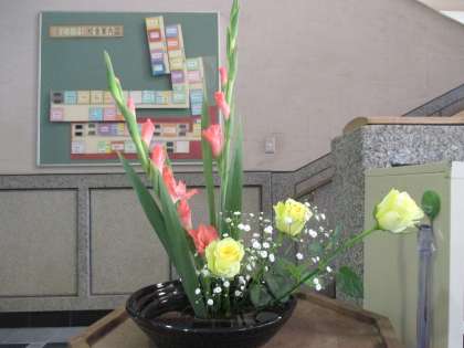 未生流笹岡の中谷先生を講師にお迎えし,グラジオラスとバラ,かすみ草を使った盛花に挑戦しました。