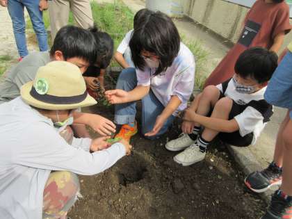ペットボトルで育てていたツルレイシを花壇に植え替えました。