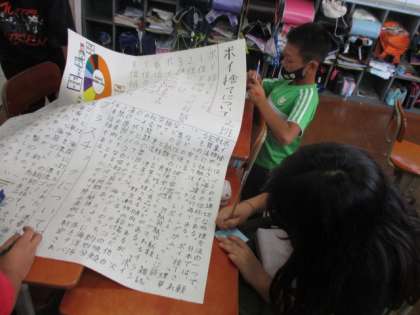 これまで国語科の学習で取り組んできた「私たちにできること」という単元の学習も終わりに近づいています。今日は他の班が作成した提案資料を読んで,よさやアドバイスを付箋に書きました。いろいろな視点からとらえることでまた新たな課題が見えてきた班もあったようです!