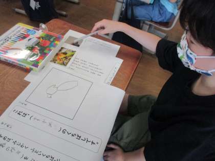 くちばしの学習を生かして,自分が選んだ鳥のくちばしクイズを作っています。文章を読んで,問いが何か,答えが何かを見つけ出しています。友だちにクイズを出すのが楽しみですね。