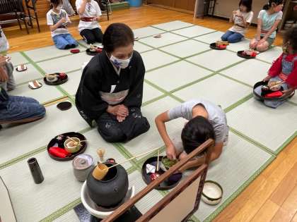 初めて参加する子どももいて,ドキドキしていました。道具の名前やお茶のたて方などたくさんのことを学びました。また,和菓子を食べる練習もありました。子どもたちが一番楽しみにしているところかもしれません。今日は若鮎でした。笑顔いっぱいの子どもたちでした。
