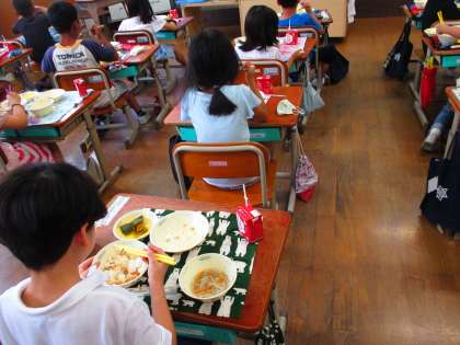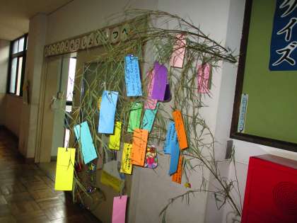 7月7日(水)の給食は,ごはん,牛乳,とりそぼろ丼(具),かぼちゃの煮つけ,七夕そうめんでした。今日の七夕そうめんは,天の川に見立てたそうめんと,星に見立てたオクラを入れて作りました。給食室の前には,笹を飾っています。笹には,みなさんの願い事を書いた短冊が結ばれています。