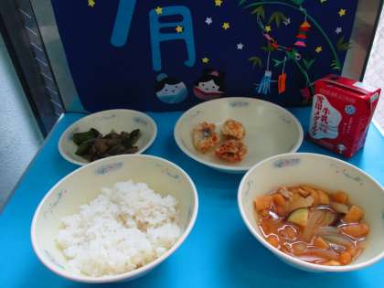 7月9日(金)は和献立で,ごはん,牛乳,はものこはくあげ,伏見とうがらし,なすのすまし汁と,京都の良さを味わえる献立でした。