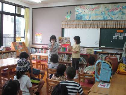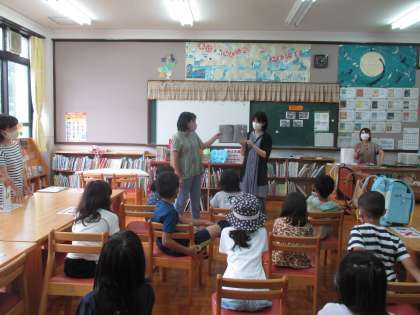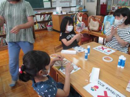 読み聞かせや工作など楽しいことばかり。今日はうちわを作り,大喜びの子どもたちです。あまりにも素敵で,地域の方が作られたうちわを校長室前に飾りました。