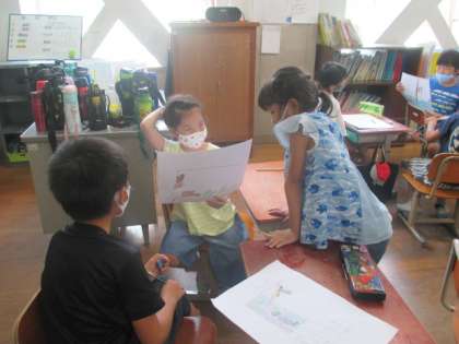 友達に描いた絵を見せながら,工夫したところを伝えることができました。