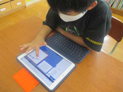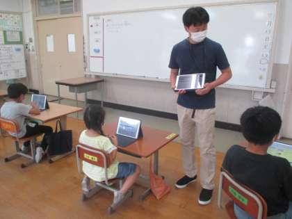 先生の説明を聞き,タブレットを使って,漢字や計算の勉強をしてみました。