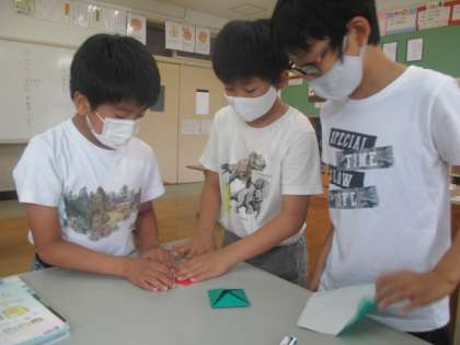 休み時間にみんなで折り紙を折っている様子がありました。