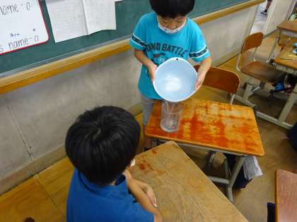 はんで えらんだ入れものに,1Lだと思うりょうの水を入れ,1Lますではかりました!