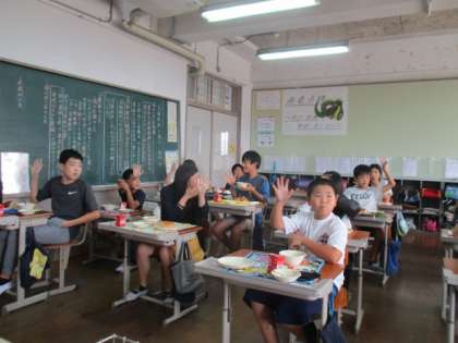 今日は給食の時間にパワーポイントを使って,給食時間の習慣について振り返りました。食事中なので,言葉に出さず,グーチョキパーのハンドサインで反応していました。