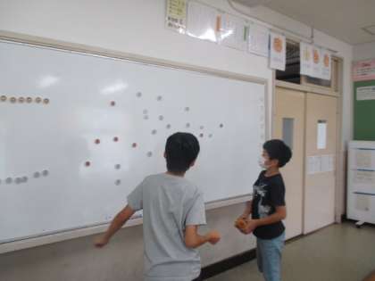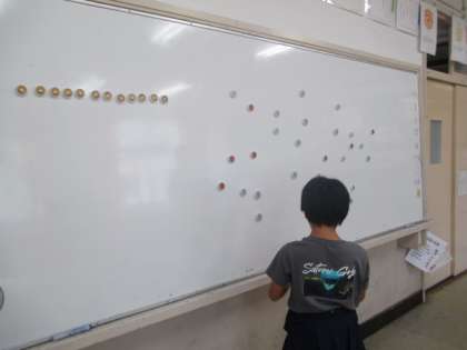 お金の種類を確認した後,ホワイトボードに散りばめられたお金の仲間集めをしました。