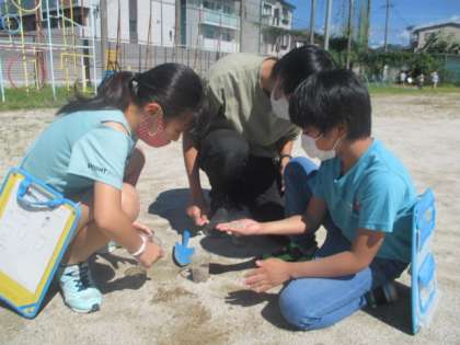 班で協力して,実験のための砂を集めていました。