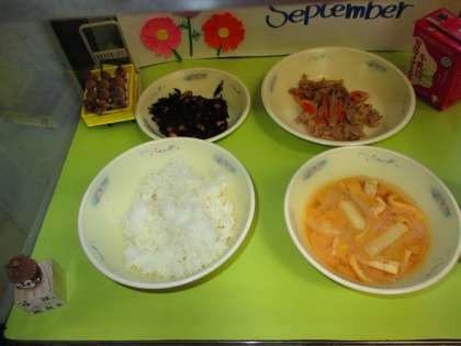 今日の給食は,ごはん,牛乳,ぶた肉のしょうがいため,ひじき豆,みそ汁でした。