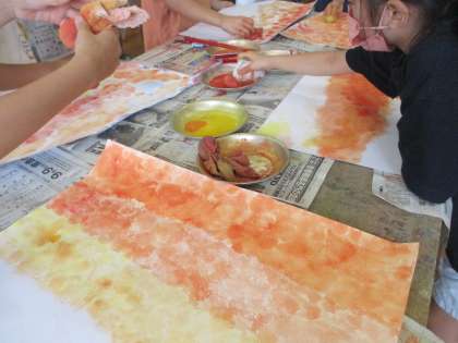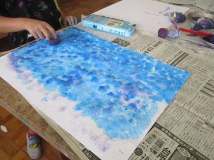 自分が描きたい場面に合う背景をつくるために,たんぽと絵の具を使って背景づくりをしました。色を重ねたり,色を変えたりしてそれぞれ素敵な背景になっていました。次回から絵を描き始めます!楽しみですね。