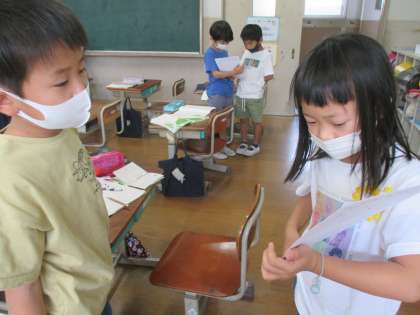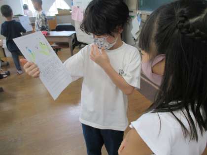 国語の「やくそく」のお話を読んで,好きな場面を伝え合いました。友だちの好きな場面を聞いて「僕と一緒ですね。」「私とは違う理由でおもしろいです。」と感想も伝えていました。