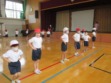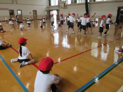 運動会で踊るダンスがどれぐらい上手になっているのかをお互いにチェックし合いました。大きく動いていることや足の動きがよくなっていることなど,友だちの良いところを自分の動きに生かしている子がたくさんいました。これからよりよくなるようにみんなで仕上げていきます!