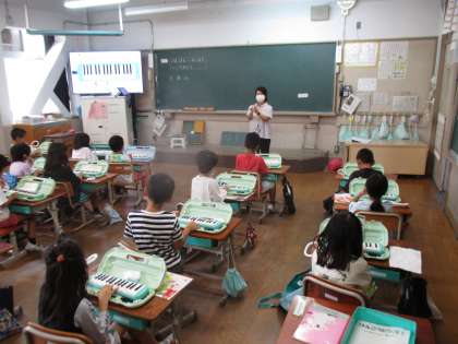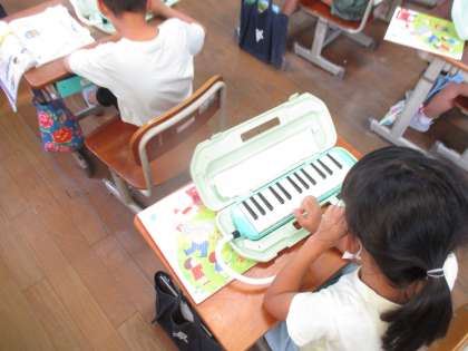 けんばんハーモニカの学習が始まりました!今日はド〜ソまでの音を大きく出したり小さく出したりしてそれぞれの音の鍵盤の場所を確認したり,吹き方の違いを学習したりしました。けんばんハーモニカを使うことができてとても嬉しそうでした。