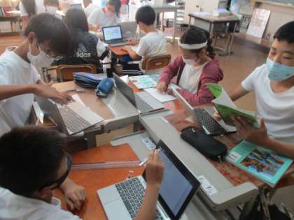 理科の学習では,GIGA端末を利用して,NHK for school などの学習サイトで地震の仕組みについて調べて,班のメンバーで共有し合いました。