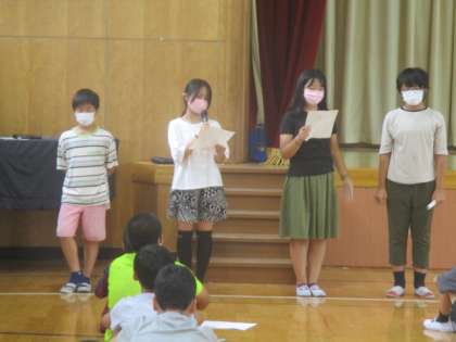 4月当初から前期児童会代表として学校の中心となり,様々な取り組みや活動を支えてきてくれた4人も今日で仕事納めでした。にこにこ集会で半年のふり返りを全校児童に向けて立派に話してくれていました。ここからは後期児童会代表の4人にバトンタッチしてまた新たなステージで活躍してもらいたいと思います。
