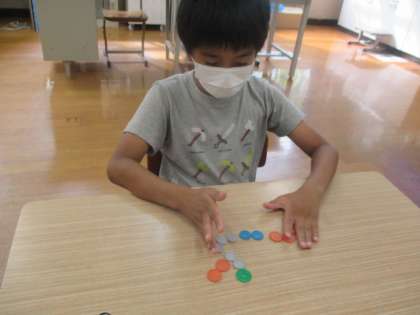 「33円ってどうやって出すの?」「50円は?」などお菓子を例にして, 1円,5円,10円,50円を使っていろいろな通りのお金の出し方があることを学習しました。