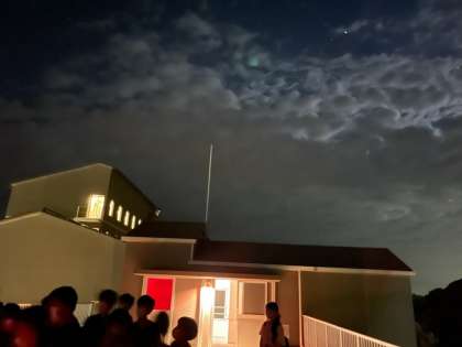 天気が少し回復したので天体観測へ。木星を望遠鏡で見ました。とてもラッキーな子どもたちです。