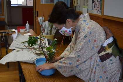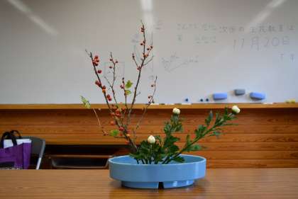 今月の花は,さんざしと菊です。さんざしの枝の曲がり具合を生かしながら,三角形のバランスを意識して飾りました。さんざしの実や菊が秋らしさを感じさせてくれます。玄関前に飾っていますので,どうぞご覧いただき季節を感じてください。