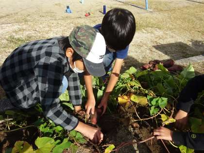 つるを ぐっと ひっぱると,土がもり上がって,さつまいもが出てきました。