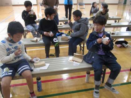 先日2年生はたくさんのなると金時「里むすめ」を収穫しました。今日はその収穫祭です。2年生はまず運動会で踊ったダンスを披露しました。そのあと,なると金時のおいしい食べ方を聞いたり,なると金時について質問したりしました。そしてお楽しみの試食。アメリカンスイートポテトと焼き芋です。「おいしい〜」と言いながらいただきました。