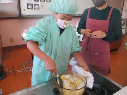 普段お家で使っている炊飯器ではなく,鍋を使って水の量や時間をしっかりはかりながらご飯を炊きました。また,ご飯を炊くときに,10月に収穫したサツマイモも入れてサツマイモご飯にしました。
