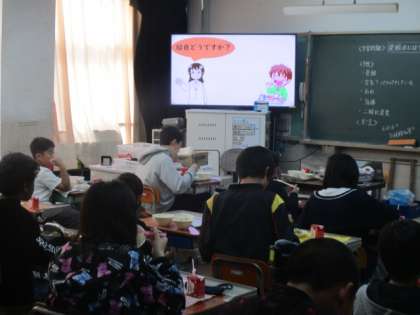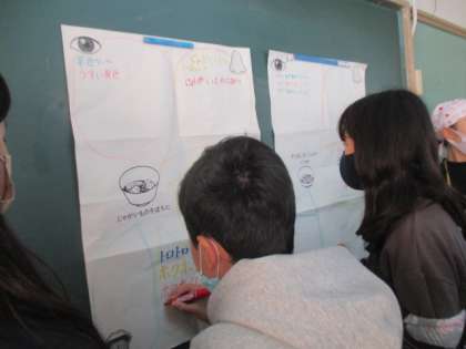 今日は給食の時間に栄養教諭の先生が教室に来て一緒においしく給食をいただきました。来てくださったのは,来週に取り組む食育の学習に向けての事前指導をしてくださいました。スライドを見ながら今日の給食を五感をつかっていただきました。