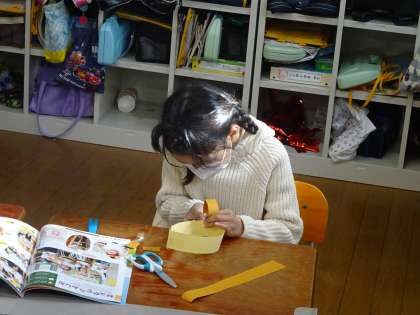 画用紙を,テープや わゴムを つかって わっかに しました。