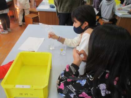 今日の理科の学習では,前回に班ごとに考えた方法をもとに,炭酸水には何が溶けているのかを確かめる実験を行いました。いくつもの班で,予想通りの結果が得られたり,実験成功を喜ぶ声が聞こえたりするなどいい検証実験になりました。
